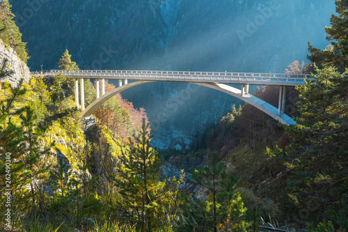 © Tadej, Fototapeta premium Bow shaped bridge over the river close to a road that is headed to Mangart saddle high in Julian alps on a sunny beautiful autumn day with colorful scenery and sun rays