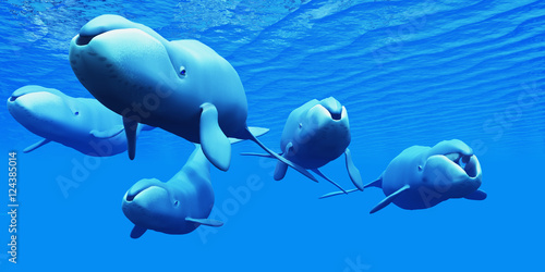 Naklejka premium Bowhead Whale Pod - Bowhead Whale wykorzystuje włókna fiszbinowe w pysku, aby odcedzić wodę morską od ofiar i żyć w strąkach kilku wielorybów.