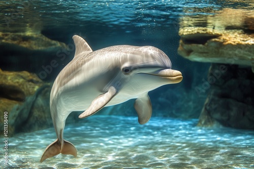 Fototapeta premium bowl-headed dolphin swimming with grace, its smooth body and large rounded head visible as it glides through the serene ocean, surrounded by light-filled waters