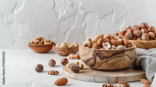 © Littleforest Stocker, Fototapeta premium Bowl of assorted nuts walnuts, almonds, peanuts, hazelnuts, and beans, no meat, Mixed nuts for health lovers, good nutrition.