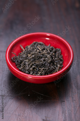 © R_Szatkowski, Fototapeta premium Bowl of dried green tea leaves on wooden background