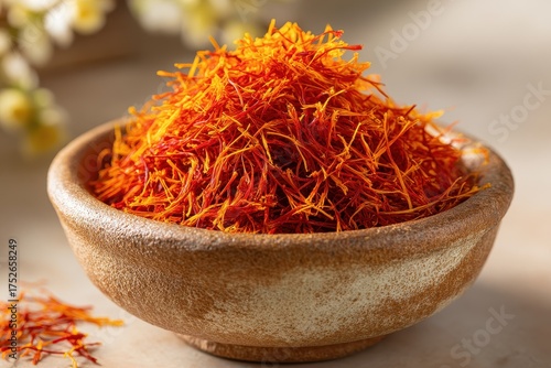 Fototapeta premium Bowl of vibrant orange saffron threads on display