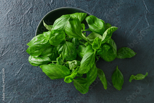 Fototapeta premium Bowl with fresh basil leaves on dark background