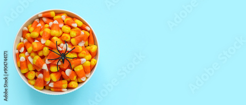 Fototapeta premium Bowl with tasty Halloween candy corns and spider on light blue background...