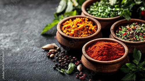 © Naveed Arts, Fototapeta premium Bowls of Indian Food Sitting on a Dark Table, Featuring an Array of Flavors and Spices for an Authentic Dining Experience
