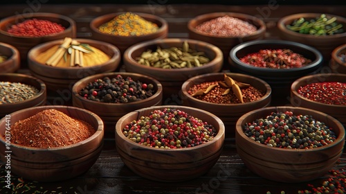© Gular, Fototapeta premium Bowls of various aromatic spices and culinary herbs Different seasoning red hot pepper paprika anise saffron black seeds nutmegs cardamom pods thyme gloves curcuma Condiments for cooking