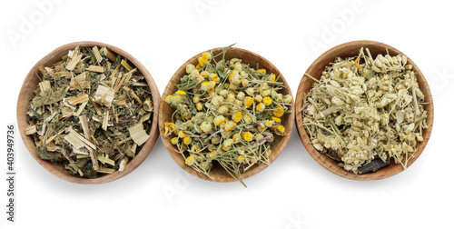 © Pixel-Shot, Fototapeta premium Bowls with different herbs on white background