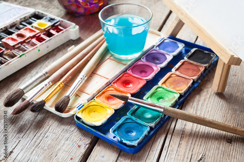 Fototapeta premium Box of watercolor paints, art brushes, glass of water and easel