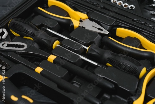 © Serhii, Fototapeta premium Box with set of tools for car repair, closeup