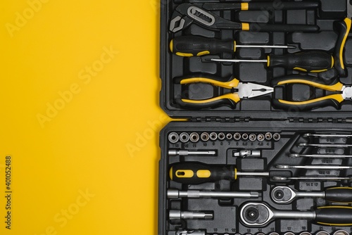 © Serhii, Fototapeta premium Box with set of tools for car repair, closeup