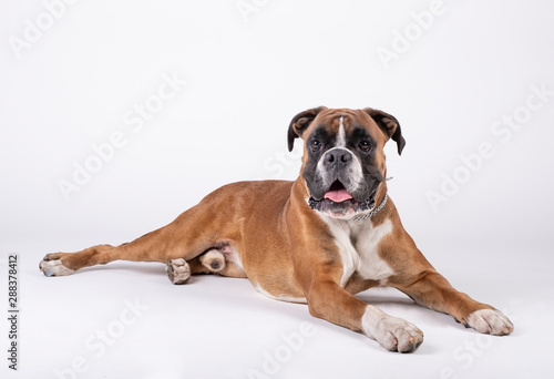 © ImagineStock, Obraz premium boxer breed dog sitting on the floor with white background