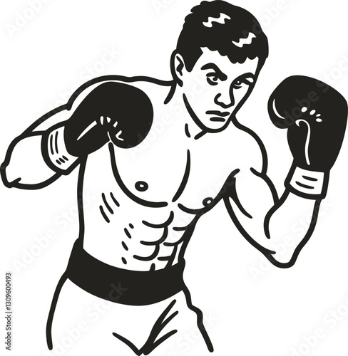 Fototapeta premium Boxer in fighting stance, vintage black and white illustration of a strong male athlete