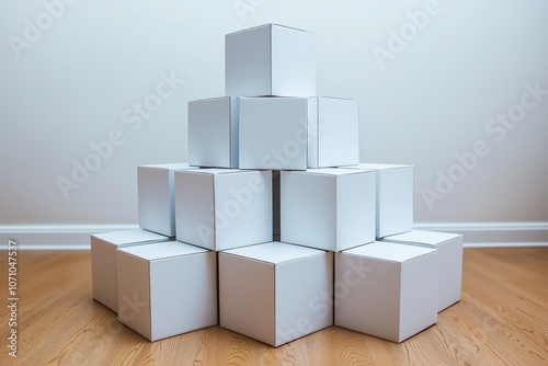 Obraz premium Boxes arranged on a light wooden floor in a minimally decorated room