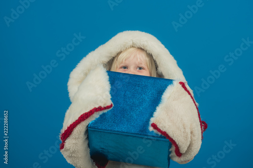 Obraz premium Boxing day before holiday celebration party. boxing day of santa kid in coat holding blue box.