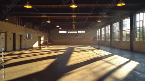 © Sandu, Fototapeta premium Boxing Ring in Sunlit Industrial Gym