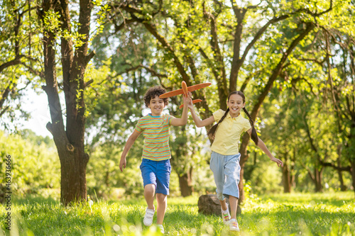 © zinkevych, Fototapeta premium Boy and girl running with toy airplane