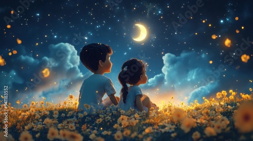 © photolas, Fototapeta premium Boy and girl sitting on a beautiful flower hill and looking into the starry night sky. 3d style cartoon character