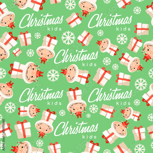 © da_on, Fototapeta premium Boy and girl wearing Christmas fancy hat : Seamless Pattern : Vector Illustration