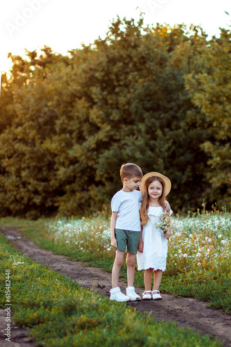Fototapeta premium boy and girl 5 years old in a field with daisies