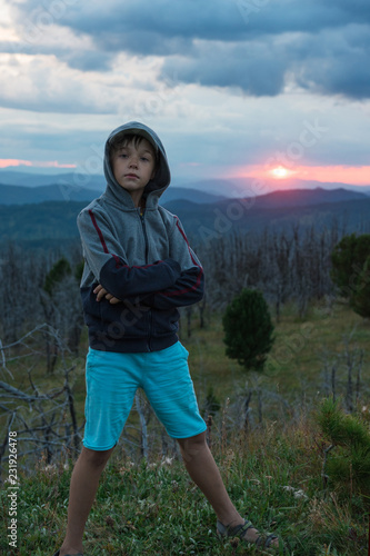 © olinchuk, Obraz premium Boy at the evening in Altai mountains