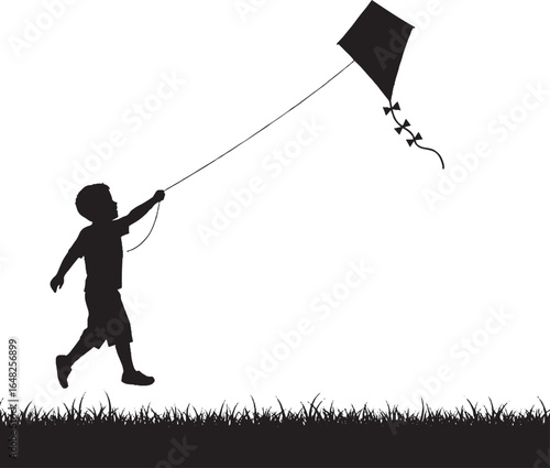 © Kafi, Obraz premium Boy Flying Kite Silhouette on Grassy Ground Vector Illustration