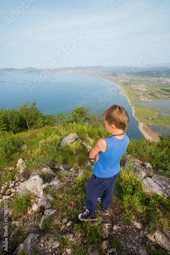 © Stanislav Komogorov, Naklejka premium Boy hiker looking down from the top of the mountain.