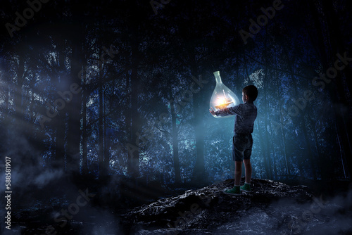© Sergey Nivens, Fototapeta premium Boy holding glass flask with landscape inside it