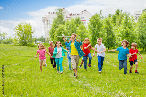 Obraz premium Boy holds big white airplane toy and kids behind