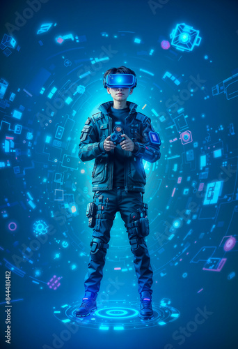 © Kris Petkong, Fototapeta premium boy in a virtual reality setting, surrounded by holographic code