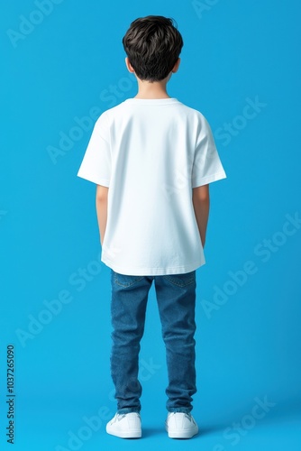 Fototapeta premium Boy in a white shirt standing against a blue background.