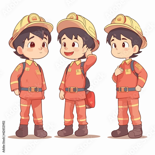 Naklejka premium Boy in firefighter attire, cartoon illustration, vector pose, young child.