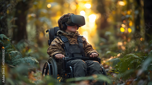 Fototapeta premium Boy in Wheelchair Exploring Nature with Virtual Reality Headset - Realistic Photo