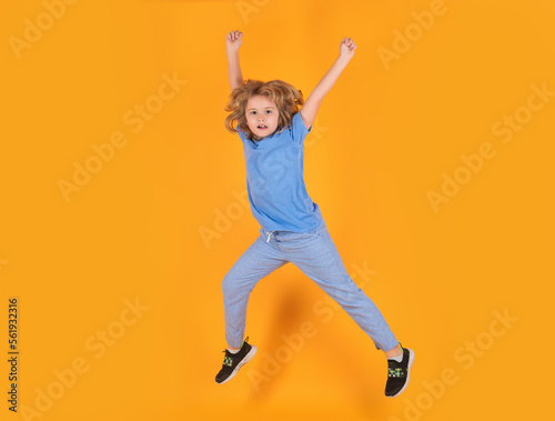 Fototapeta premium Boy jumping. Full size of kid boy have fun jump up isolated over yellow...