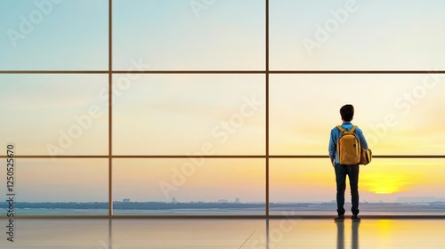 Obraz premium Boy Looking Through Airport Window at Sunset