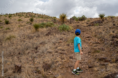 © Robbie Green, Fototapeta premium boy looking up mountain trail in desert