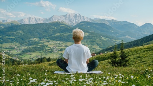 Naklejka premium Boy meditating mountain vista, peaceful alpine scene, healthy lifestyle
