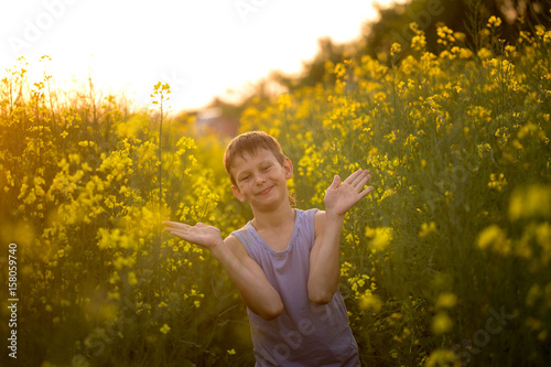 Naklejka premium Boy on a yellow rapeseed field in the evening at sunset