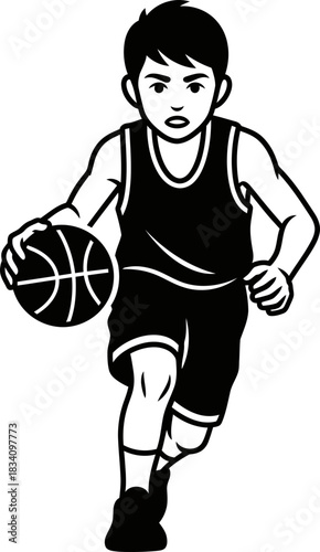 Fototapeta premium Boy playing basketball. Athlete with ball. Sport activity, game, and healthy lifestyle concept. Black and white vector illustration for design