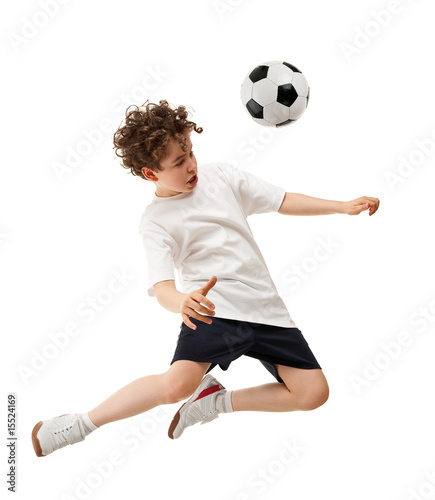 © Jacek Chabraszewski, Fototapeta premium Boy playing football isolated on white background