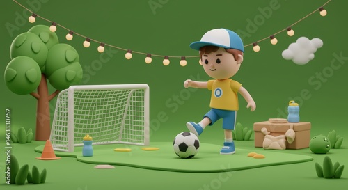 © ndhtr, Fototapeta premium Boy Playing Soccer in Green Field