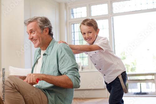 © KOTO, Obraz premium Boy pushing father on tricycle indoors
