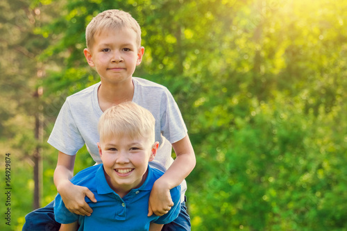© R, Fototapeta premium Boy sitting on the back of a friend in the sunshine