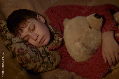 Obraz premium boy sleep in bed with bear toy