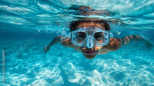 © Afan, Naklejka premium Boy snorkeling in clear ocean water over sandy seabed