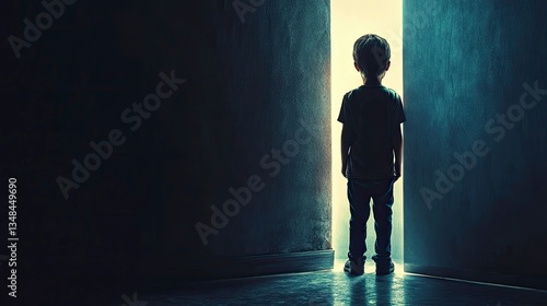 © Dzikrul Husnani, Obraz premium Boy Standing in Doorway with Light Shining Through in a Dark Room