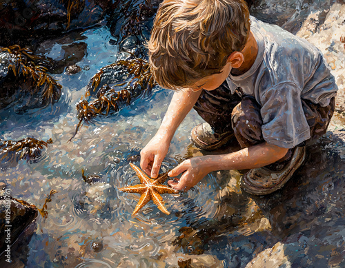 © Jeerawat, Obraz premium Boy & Starfish