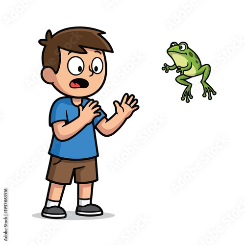 Obraz premium Boy surprised by a jumping green frog in cartoon style