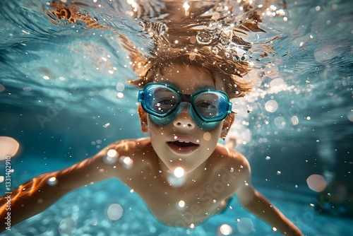 Fototapeta premium Boy Swimming Underwater in Blue Goggles: Fun Summer Activity