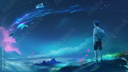 © Noppakun, Fototapeta premium Boy Watching Flying Whales in Night Sky