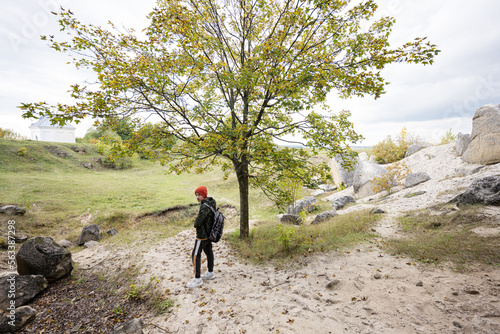 Fototapeta premium Boy wear backpack explore limestone stone cave at mountain in Pidkamin, Ukraine.